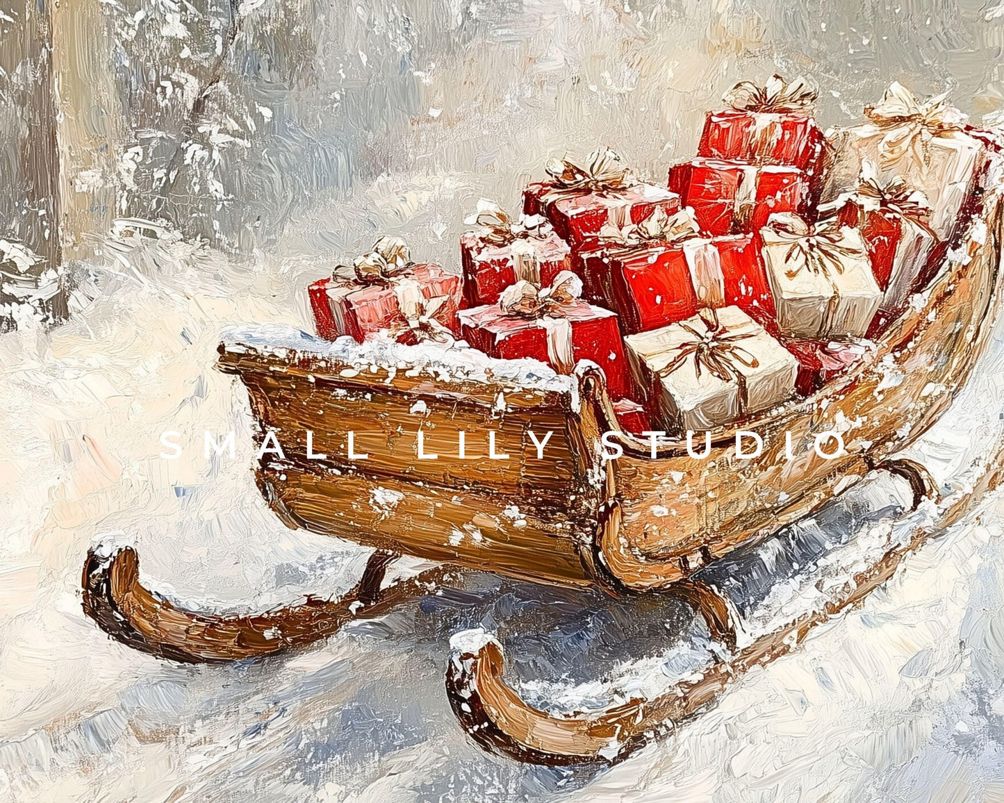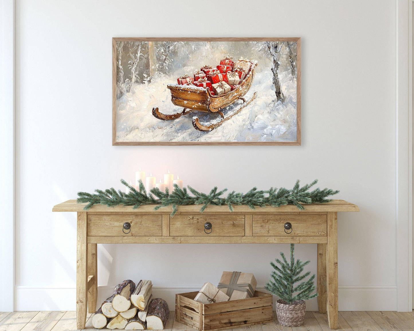 This Samsung Frame TV art is a digital download of a unique Christmas artwork that can transform your Samsung FrameTV into a stunning piece of art. In the style of a vintage painting, this festive artwork features a sleigh filled with presents. It's perfect for setting the mood this holiday season. The appearance of brushstrokes will convince everyone that a real vintage painting is on your wall!
